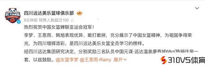 而四川女篮也以奖励房子的方式来奖励这三位国手,详细是说:“李梦、王思雨、韩旭为祖国争得荣光,为四川增辉添彩,是四川远达美乐女篮全员学习的典范。经四川远达集团研讨决议,区分奖励三名队员温泉康养城住房一套。”