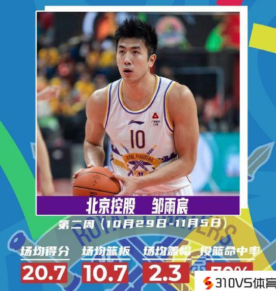 邹雨宸用出色表现成为北控的外线基石,率领北控一波3连胜后,战绩提升至4胜2负排在联赛第5名。目前邹雨宸场均19.8分与费尔德并列全队最高,成为球队的得分王,也是生涯初次取得周最佳荣誉。