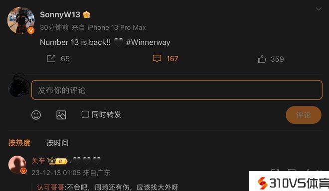 威姆斯详细是说:“Number 13 is back!! Winnerway”随后广东男篮跟队记者关辛在评论区评价了三个爱心表情,很显然,他在欢迎威姆斯回归球队。