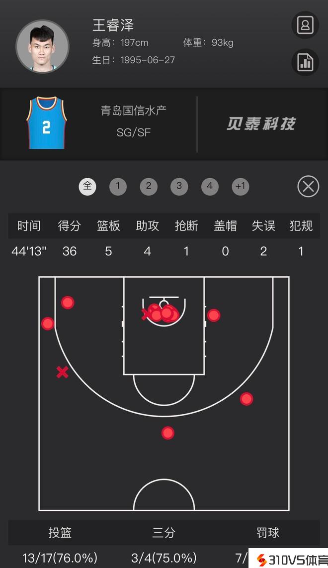 全场竞赛打完,王睿泽投篮17中13高效砍下36分5篮板4助攻,单场36分发明王睿泽生涯新高,也是他生涯初次得分超越30分,可以说是发明了一个里程碑。