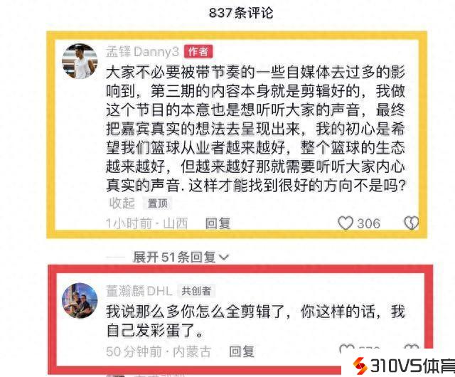 第三集播出后,孟泽在视频的评论区留言配文说道:大家不用要被带节拍的一些自媒体去过多的影响到,第三期的内容自身就是剪辑好的,我做这个节目的本意也是想听听大家的声响,最终把嘉宾真实的想法去出现出来,我的初心是希望我们篮球从业者越来越好,整个篮球的生态越来越好,但越来越好那就需求听听大家内心真实的声响.这样才干找到很好的方向不是吗?