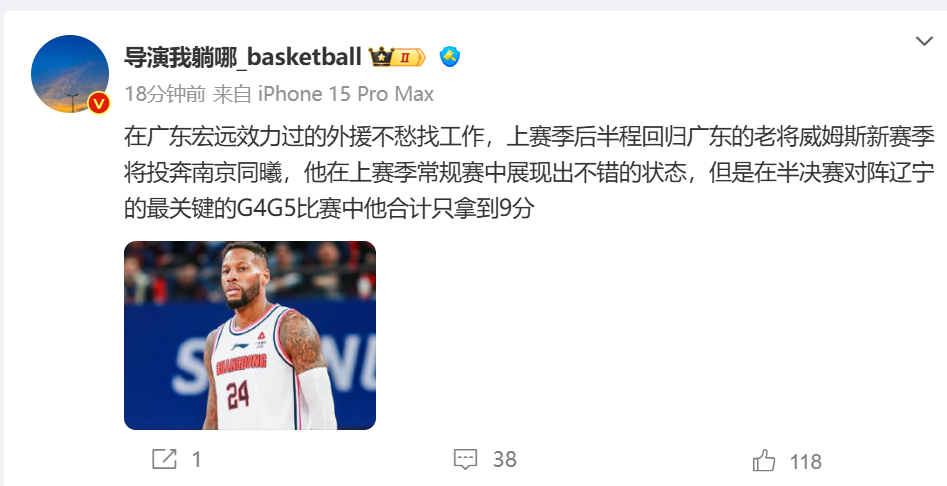 北京时间8月19日讯,根据媒体人@导演我躺哪_basketball报道:威姆斯新赛季将加盟南京同曦男篮。原文如下: