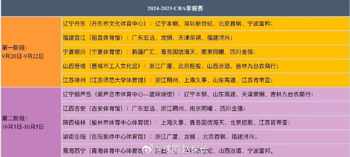 ✅媒体人发布CBA季前赛分组 共两个阶段&十个城市