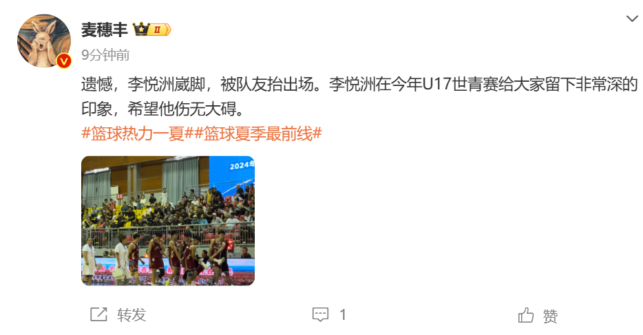 根据媒体人@麦穗丰报道:遗憾,李悦洲崴脚,被队友抬出场。李悦洲在今年U17世青赛给大家留下非常深的印象,希望他伤无大碍。