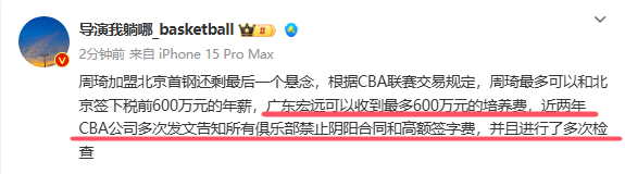 媒体人@导演我躺哪表示广东宏远最多可以收取600万元的培养费,近几年CBA公司多次发文禁止阴阳合同和高额签字费。