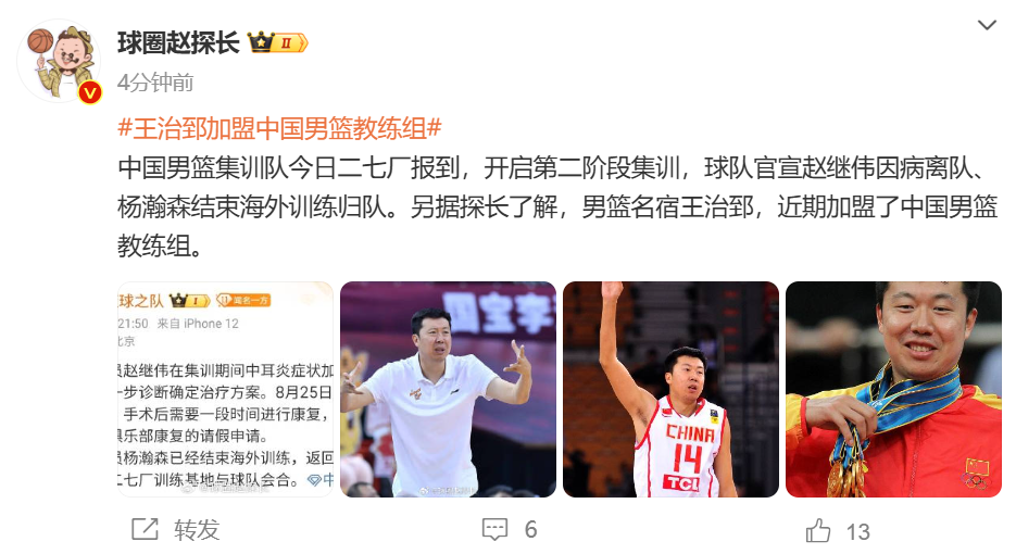 北京时间8月27日讯,根据媒体人@球圈赵探长报道:中国男篮集训队今日二七厂报到,开启第二阶段集训,球队官宣赵继伟因病离队、杨瀚森结束海外训练归队。另据探长了解,男篮名宿王治郅,近期加盟了中国男篮教练组。