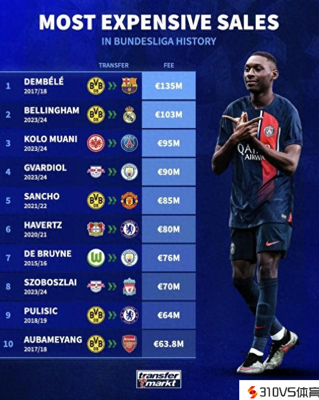 德甲转出转会费前十:登贝莱第一&贝林第二,今夏4人入围