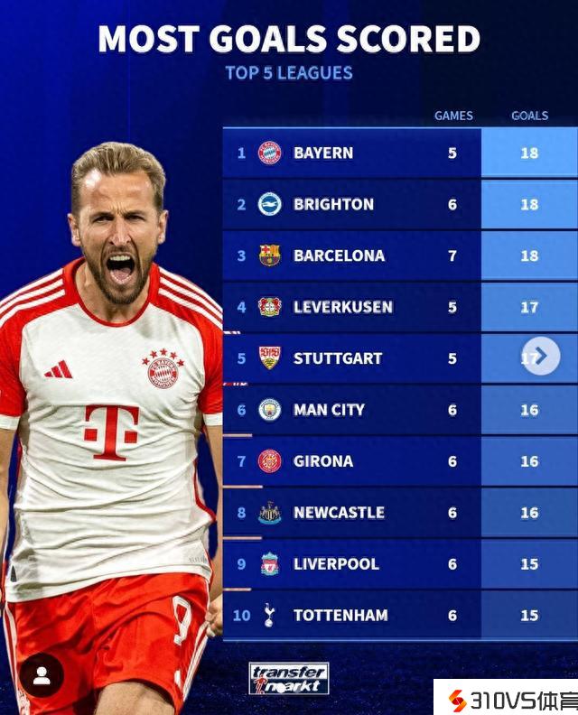 本赛季五大联赛进球榜:拜仁5场18球居首,巴萨,曼城在列