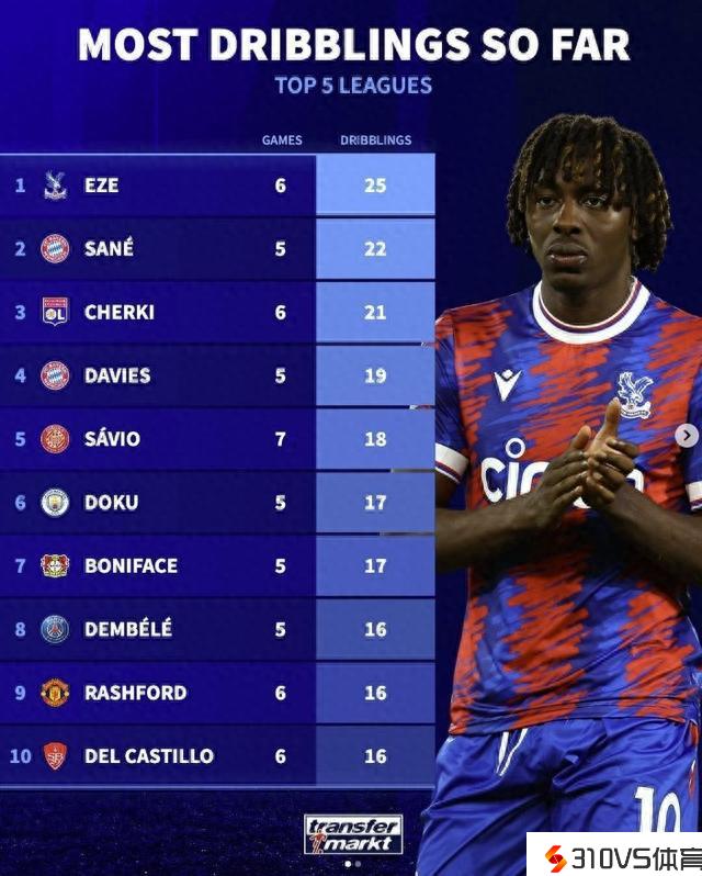 五大联赛过人数排行:埃泽、萨内前二,多库第6