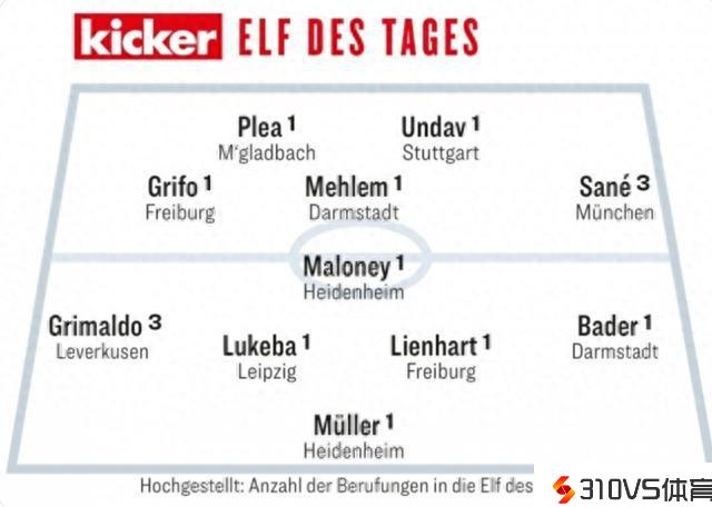 踢球者德甲第6轮最佳阵容:萨内、卢克巴、格里马尔多中选