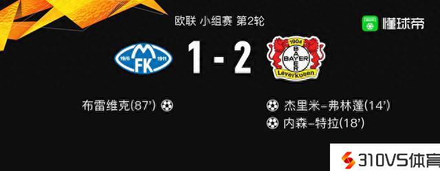 莫尔德vs勒沃库森球员评分:布雷维克7.6分,奥迪隆6.0分