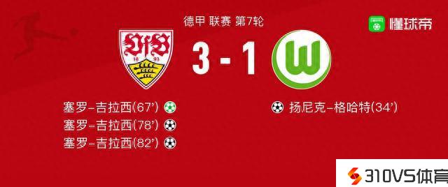 斯图加特vs沃尔夫斯堡球员评分:塞罗-吉拉西9.9分