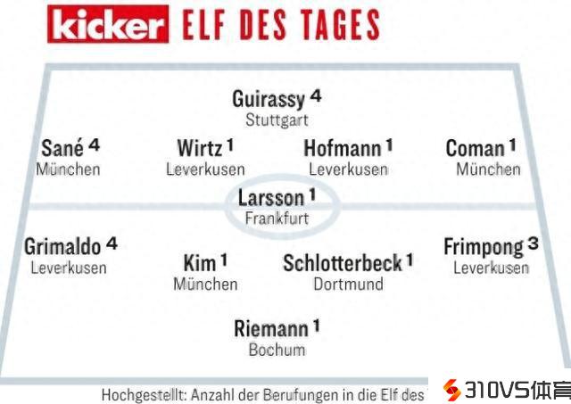 踢球者德甲本轮最佳阵容:萨内、金玟哉和维尔茨中选