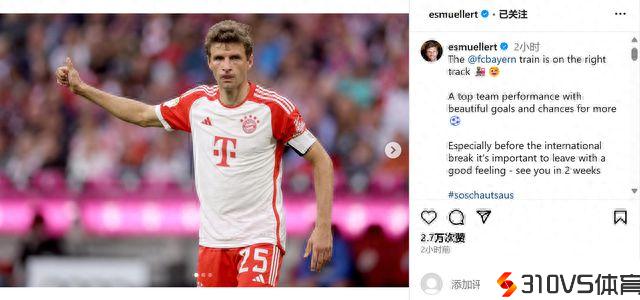 赛后穆勒也在团体社媒晒出本场照片,配文写道:“拜仁列车驶在正确的轨道之上,球队拿出了顶级的表现,几粒进球都很精彩,我们还无时机打进更多进球。在国际竞赛周之前带着好意境分开十分重要,两周后我们再见!”