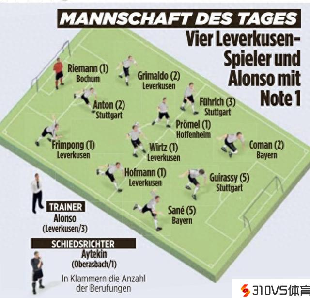 图片报德甲本轮最佳阵容:勒沃库森五人中选,科曼、萨内在列