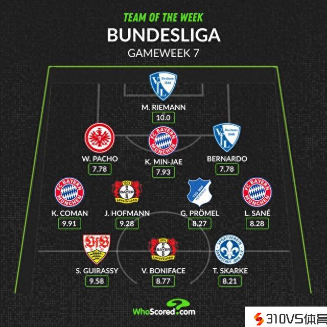 WhoScored德甲第7轮最佳阵:金玟哉、萨内、科曼、吉拉西在列