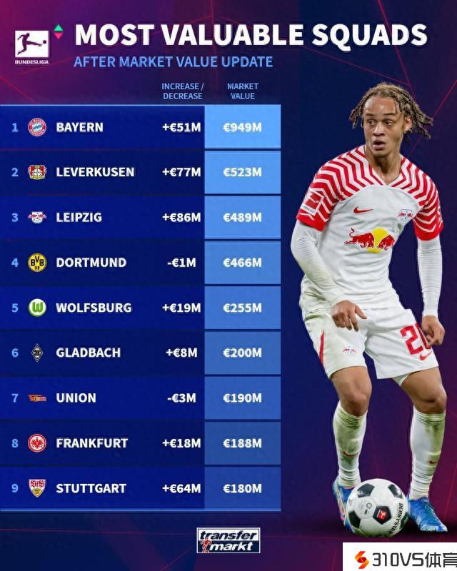 德甲身价榜:拜仁居首,药厂第二莱比锡第三,多特跌至第四
