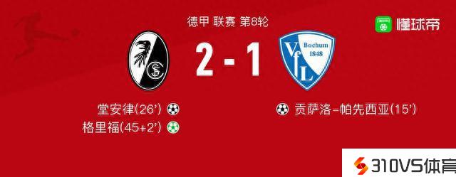 北京时间10月21日德甲 联赛 第8轮,弗赖堡主场对阵波鸿。弗赖堡堂安律破门,格里福破门。波鸿贡萨洛-帕先西亚破门。最终比分2-1。