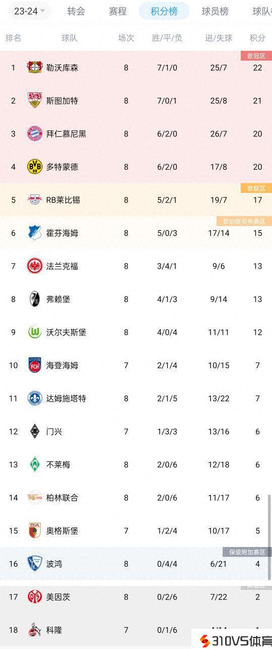 德甲积分榜:勒沃库森领跑,斯图加特第二,拜仁、多特第三四位