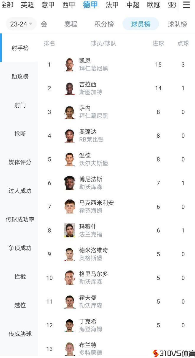 德甲射手榜:凯恩10轮15球居首,吉拉西8轮14球第二,萨内8球第三
