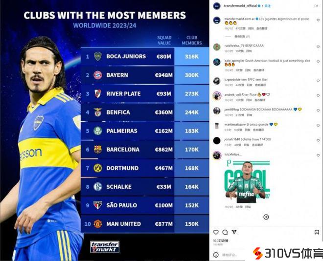 德国转会市场清点了世界足坛会员人数最多的俱乐部前十排名,博卡青年第一。