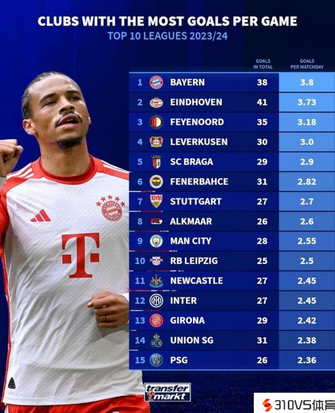 本赛季欧洲前十联赛场均进球榜:拜仁3.8球居首,曼城、国米在列