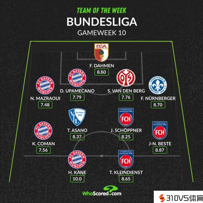 WhoScored德甲第10轮最佳阵:凯恩10分领衔,科曼、于帕在列