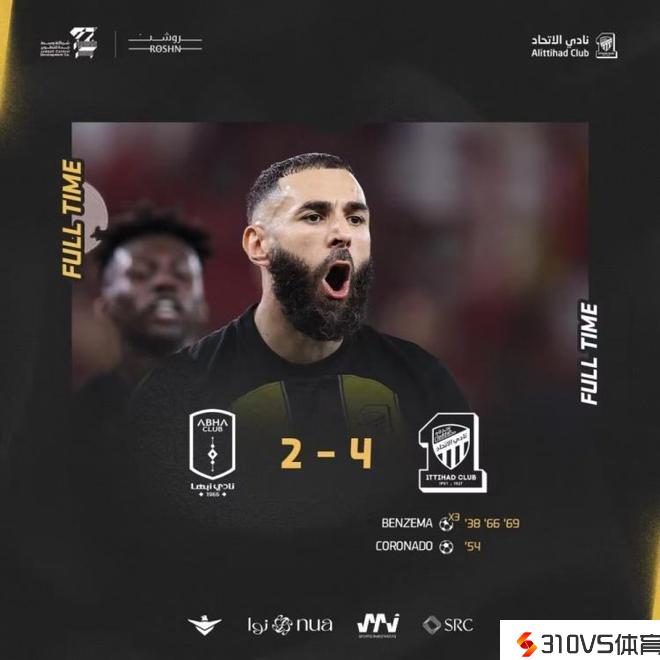 沙特联赛第13轮,吉达结合主场4-2击败艾卜哈,完毕5轮不胜。本泽马贡献3球1助攻,参与全部4粒进球,科罗纳多录得1球2助攻。