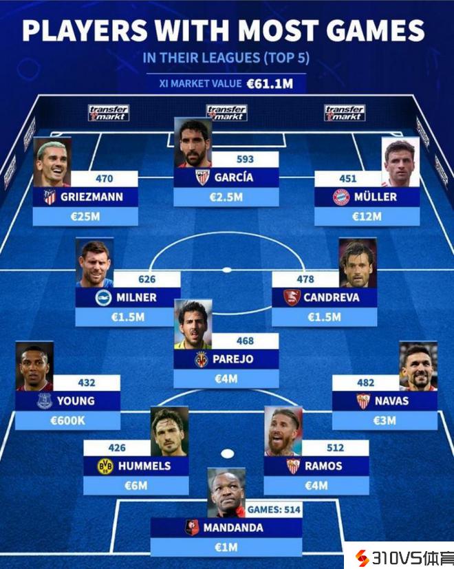 德国转会市场日前清点了五大联赛出场次数最多的球员阵容,米尔纳在英超出场626次,是阵容中最多的。