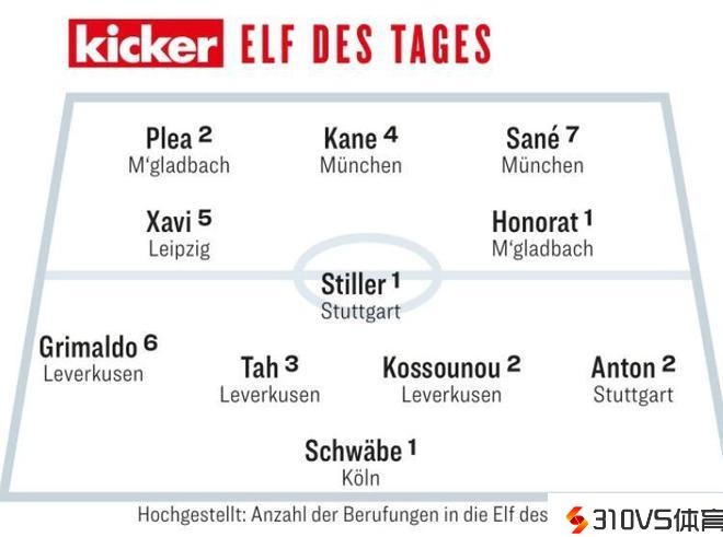 踢球者德甲本轮最佳阵容:凯恩领衔,萨内第7次中选