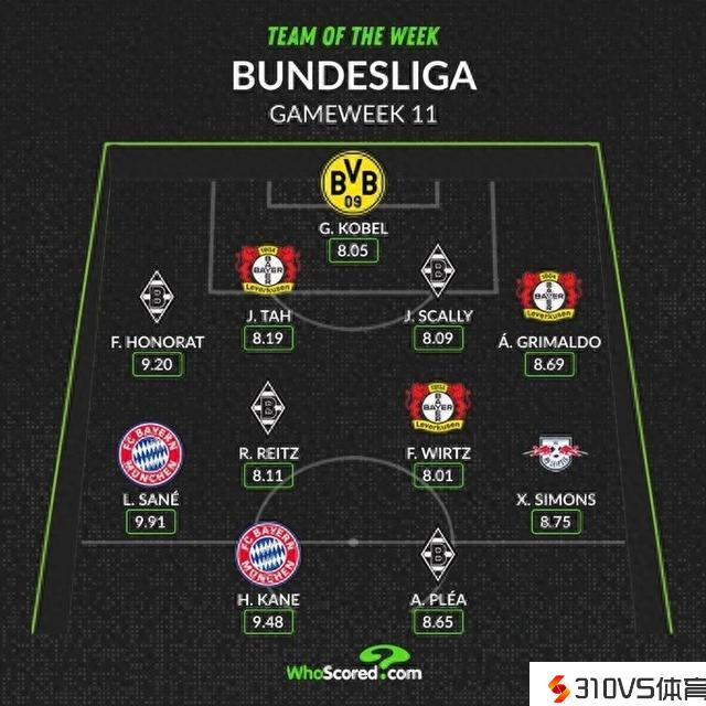 WhoScored德甲第11轮最佳阵:凯恩萨内领衔,药厂3人门兴4人