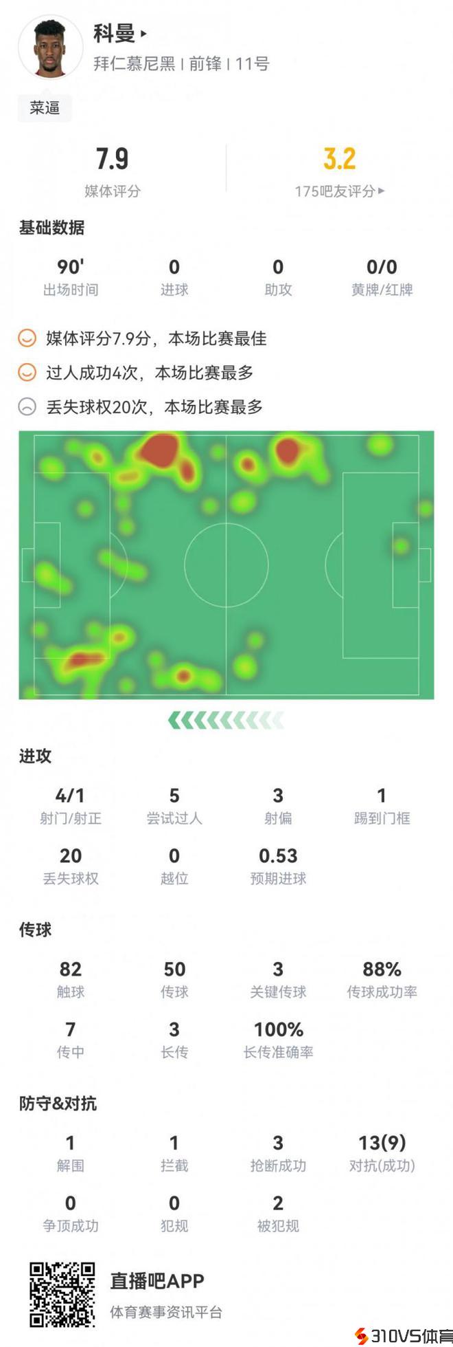 科曼数据:5次过人4次成功 20次丧失球权 评分7.9全场最高