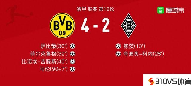 多特蒙德vs门兴格拉德巴赫球员评分:菲尔克鲁格8.6分,哈克6.0分