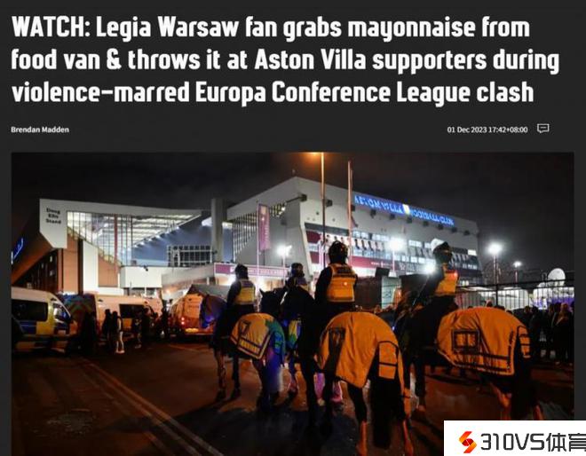 进球网:华沙球迷用蛋黄酱攻击维拉球迷,自己却被绊倒引来讪笑