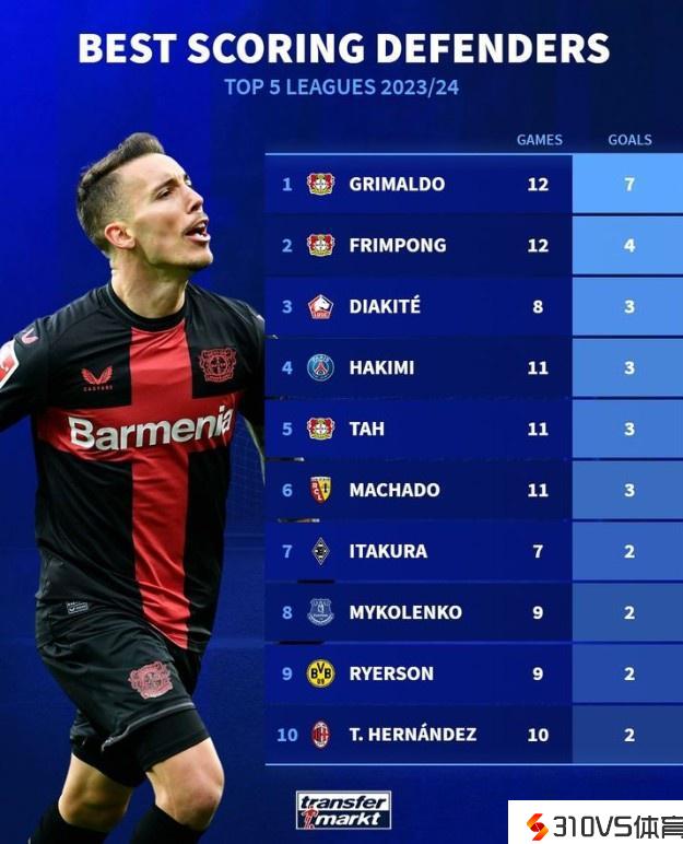 五大联赛本赛季后卫进球榜:药厂两翼格里马尔多、弗林蓬前二