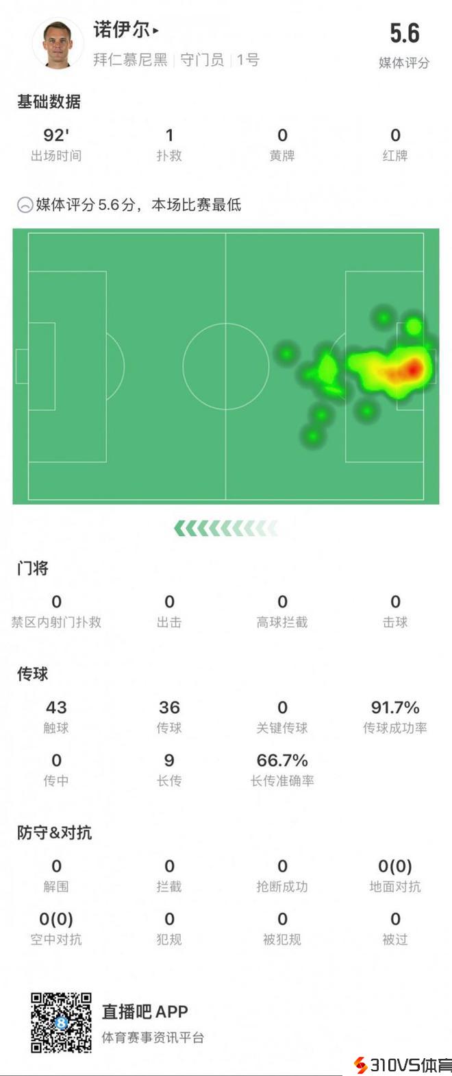 诺伊尔vs法兰克福全场贡献1次扑救,丢5球,获评5.6分全场最低