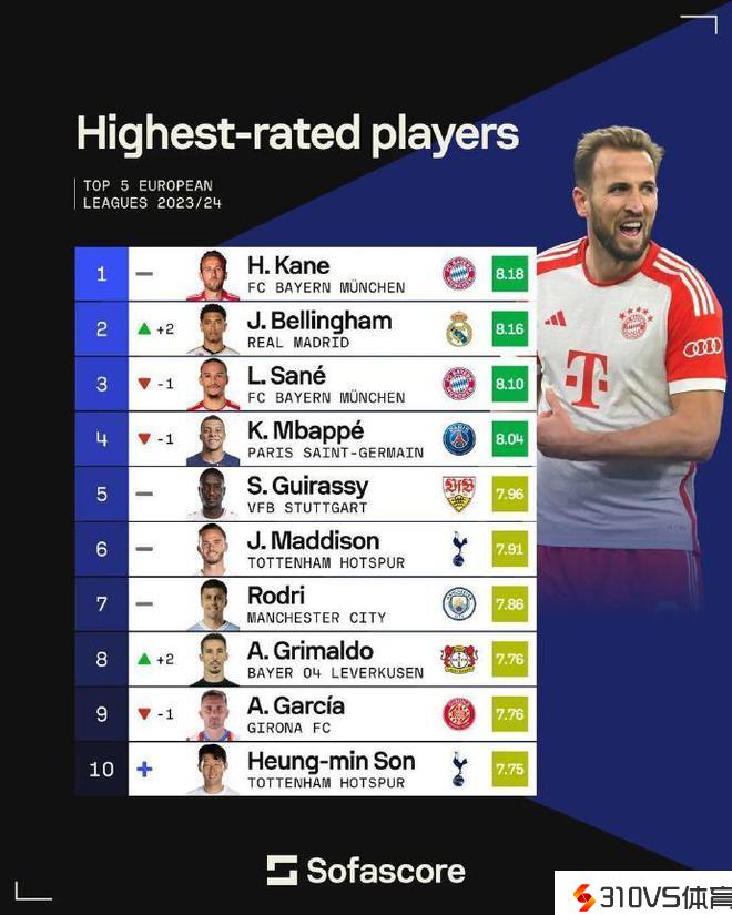 五大联赛球员场均评分:凯恩领跑,孙兴慜跻身前十名