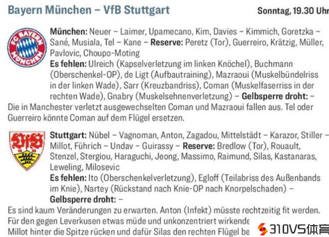 踢球者预测拜仁vs斯图加特首发:凯恩对阵吉拉西