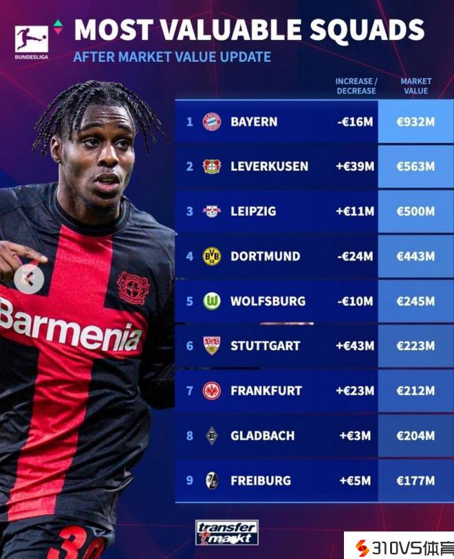 德甲球队身价榜:拜仁9.32亿欧居首,勒沃库森次席,多特第四