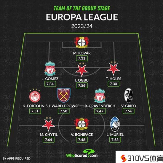 中场:福图尼斯(奥林匹亚科斯,7.51分)、沃德-普劳斯(西汉姆,7.50分)、赫拉芬贝赫(利物浦,7.47分)、格里福(弗赖堡,7.56分)