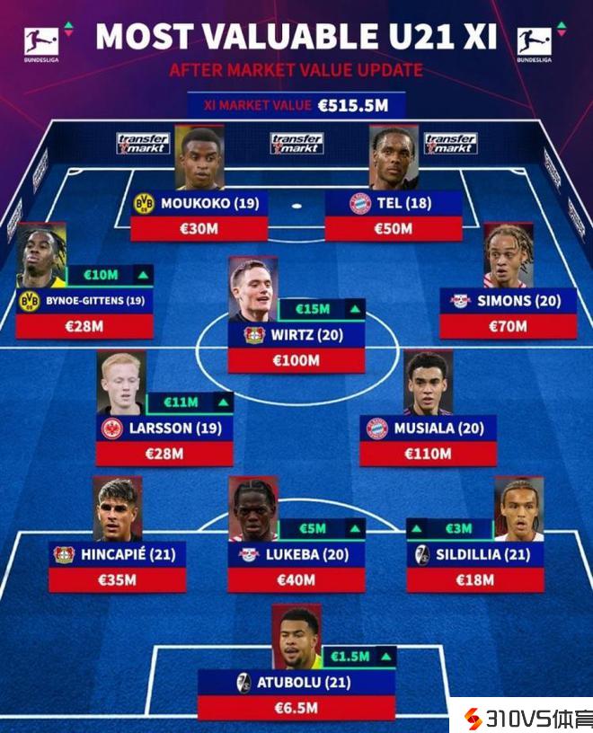 德甲U21球员最贵阵容:穆西亚拉&维尔茨领衔,穆科科、特尔在列