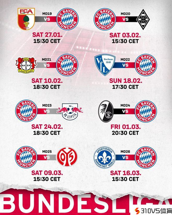 拜仁德甲第19-26轮赛程:大年终二1:30天王山之战对阵药厂
