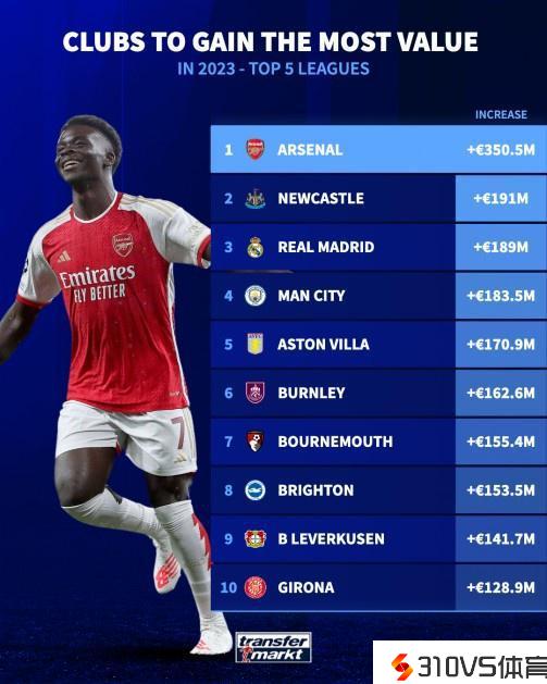 往年各队阵容升值榜:阿森纳涨3.5亿欧居首,皇马第三曼城第四
