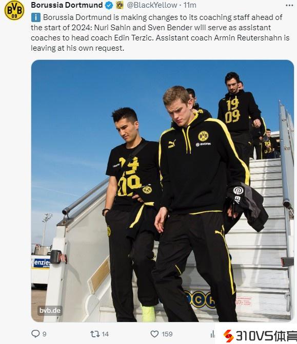 官方:沙欣和本德回归多特,担任一线队助理教练