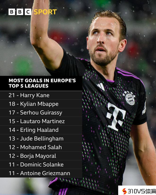 神锋!凯恩21球领跑五大联赛,姆巴佩18球第2 劳塔罗第4哈兰德第5