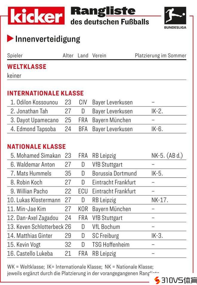 踢球者德甲中卫评级:世界级空缺,勒沃库森三中卫+于帕洲际级