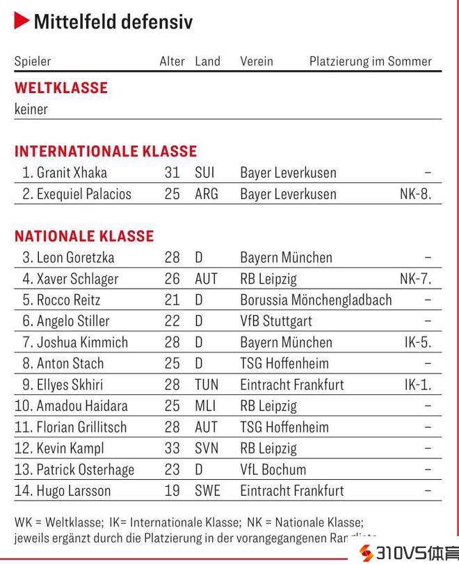 踢球者德甲防卫型中场评级:扎卡领衔洲际级,基米希国脚级