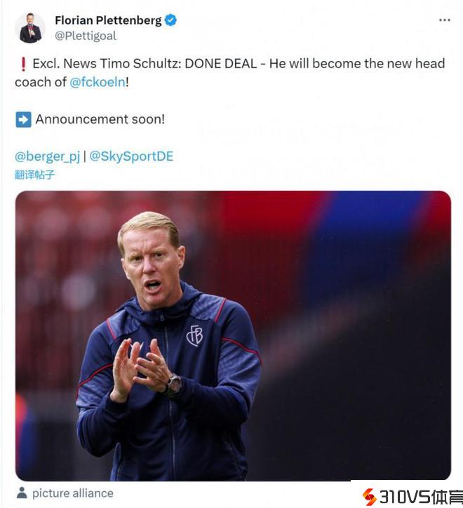 德天空记者:蒂莫-舒尔茨将成为科隆新任主帅