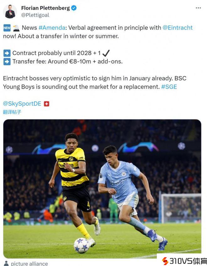记者;法兰克福将签年轻人中卫阿门达,转会费800万到1000万欧
