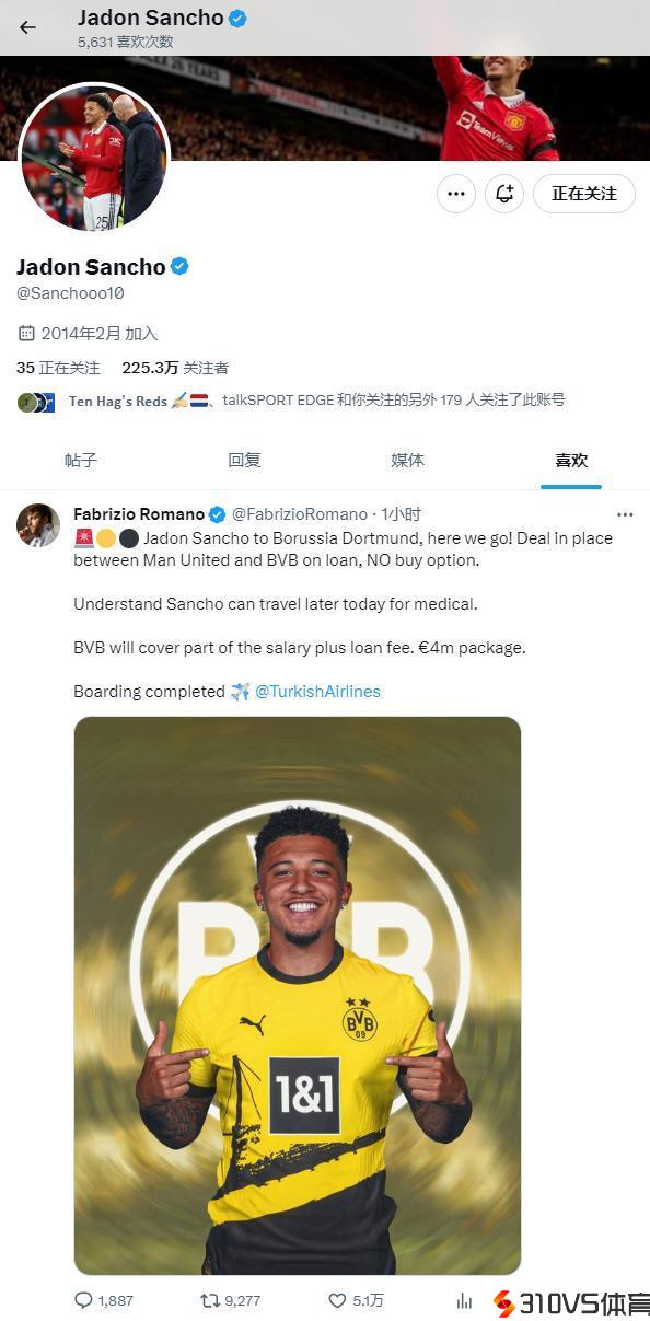 满心欢欣回多特!桑乔点赞了罗马诺的Here We Go报道
